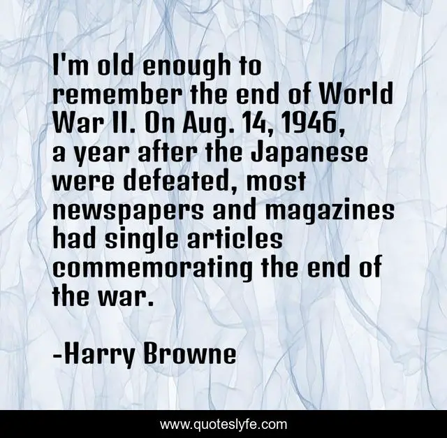 This page presents the quote "I'm old enough to remember the end of World War II. On Aug. 14, 1946, a year after the Japanese were defeated, most newspapers and magazines had single articles commemorating the end of the war.". Author of this quote is Harry Browne. This quote is about world, end, remember,.