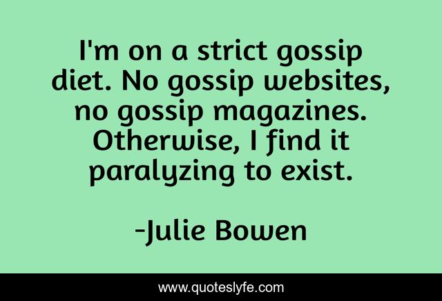 This page presents the quote "I'm on a strict gossip diet. No gossip websites, no gossip magazines. Otherwise, I find it paralyzing to exist.". Author of this quote is Julie Bowen. This quote is about gossip, find, websites,.