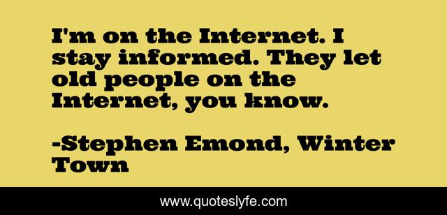 This page presents the quote "I'm on the Internet. I stay informed. They let old people on the Internet, you know.". Author of this quote is Stephen Emond, Winter Town. This quote is about humor, elderly, internet,.