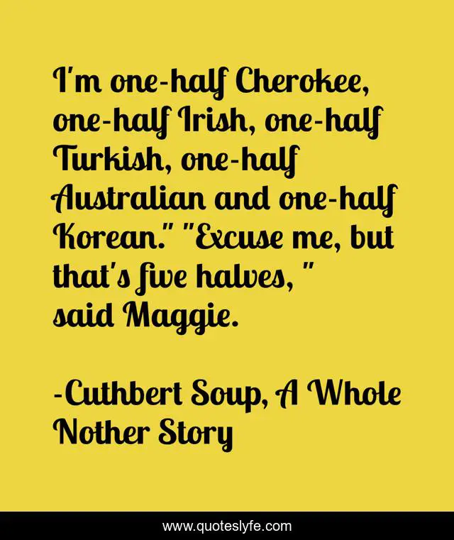 This page presents the quote "I'm one-half Cherokee, one-half Irish, one-half Turkish, one-half Australian and one-half Korean." "Excuse me, but that's five halves, " said Maggie.". Author of this quote is Cuthbert Soup, A Whole Nother Story. This quote is about funny, comedy,.