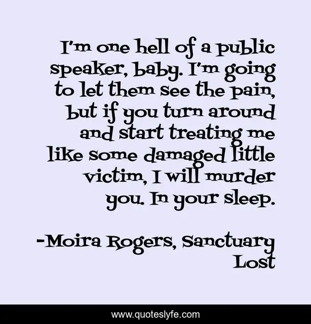 This page presents the quote "I’m one hell of a public speaker, baby. I’m going to let them see the pain, but if you turn around and start treating me like some damaged little victim, I will murder you. In your sleep.". Author of this quote is Moira Rogers, Sanctuary Lost. This quote is about urban-fantasy, paranormal-romance,.