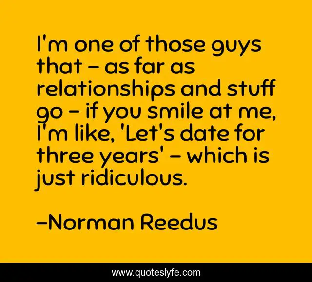 This page presents the quote "I'm one of those guys that - as far as relationships and stuff go - if you smile at me, I'm like, 'Let's date for three years' - which is just ridiculous.". Author of this quote is Norman Reedus. This quote is about me, relationships,.