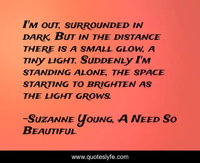 This page presents the quote "I'm out, surrounded in dark. But in the distance there is a small glow, a tiny light. Suddenly I'm standing alone, the space starting to brighten as the light grows.". Author of this quote is Suzanne Young, A Need So Beautiful. This quote is about remembering, charlotte, darkness, light, dark, remembrance, monroe,.