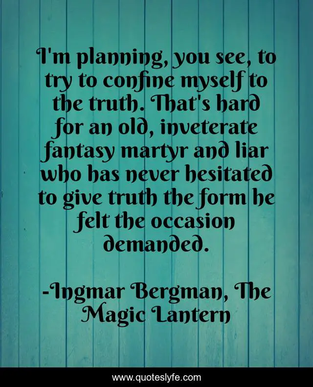 This page presents the quote "I'm planning, you see, to try to confine myself to the truth. That's hard for an old, inveterate fantasy martyr and liar who has never hesitated to give truth the form he felt the occasion demanded.". Author of this quote is Ingmar Bergman, The Magic Lantern. This quote is about lies, life, truth,.
