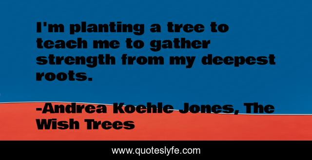 This page presents the quote "I'm planting a tree to teach me to gather strength from my deepest roots.". Author of this quote is Andrea Koehle Jones, The Wish Trees. This quote is about tree-of-life, children-s-literature, tree-planting, children-s-books, trees, strength-of-character, children, roots,.