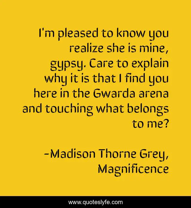 This page presents the quote "I'm pleased to know you realize she is mine, gypsy. Care to explain why it is that I find you here in the Gwarda arena and touching what belongs to me?". Author of this quote is Madison Thorne Grey, Magnificence. This quote is about madison-thorne-grey, fantasy-romance, alpha-males, romance-novels, alpha-heroes, paranormal-romance,.