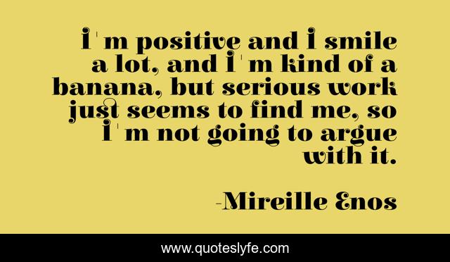 This page presents the quote "I'm positive and I smile a lot, and I'm kind of a banana, but serious work just seems to find me, so I'm not going to argue with it.". Author of this quote is Mireille Enos. This quote is about me, smile, work, happiness,.