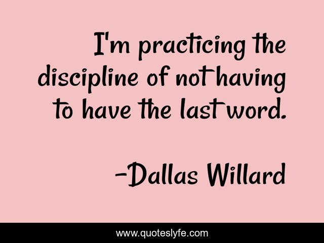 This page presents the quote "I'm practicing the discipline of not having to have the last word.". Author of this quote is Dallas Willard. This quote is about peace-of-mind, quietness, circumspection,.