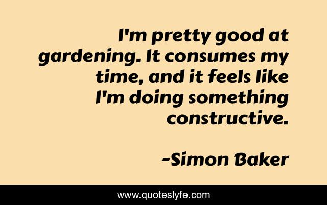 This page presents the quote "I'm pretty good at gardening. It consumes my time, and it feels like I'm doing something constructive.". Author of this quote is Simon Baker. This quote is about good, time,.