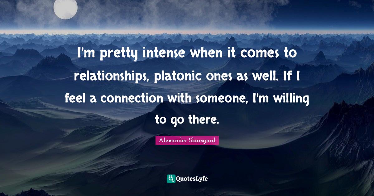 This page presents the quote "I'm pretty intense when it comes to relationships, platonic ones as well. If I feel a connection with someone, I'm willing to go there.". Author of this quote is Alexander Skarsgard. This quote is about willing, intense, feels, platonic, connections,.