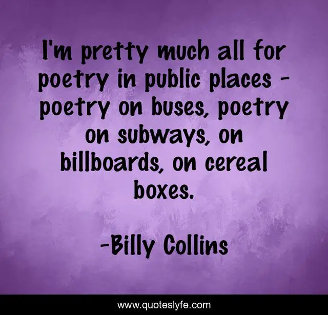 This page presents the quote "I'm pretty much all for poetry in public places - poetry on buses, poetry on subways, on billboards, on cereal boxes.". Author of this quote is Billy Collins. This quote is about places, pretty, cereal,.