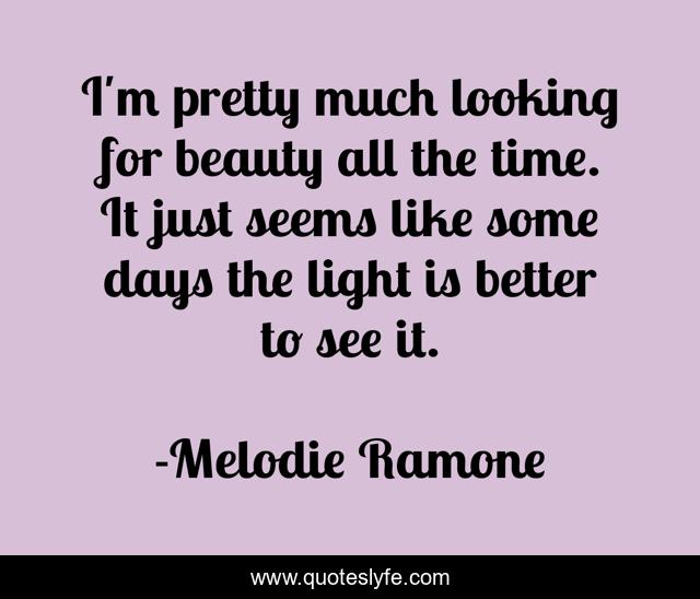 This page presents the quote "I'm pretty much looking for beauty all the time. It just seems like some days the light is better to see it.". Author of this quote is Melodie Ramone. This quote is about author, art, hope, inspiration,.