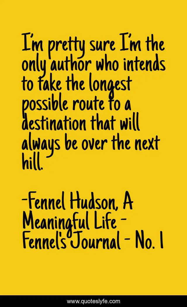 This page presents the quote "I’m pretty sure I’m the only author who intends to take the longest possible route to a destination that will always be over the next hill.". Author of this quote is Fennel Hudson, A Meaningful Life - Fennel's Journal - No. 1. This quote is about writer, writers-on-writing, author, writing, writers-life,.