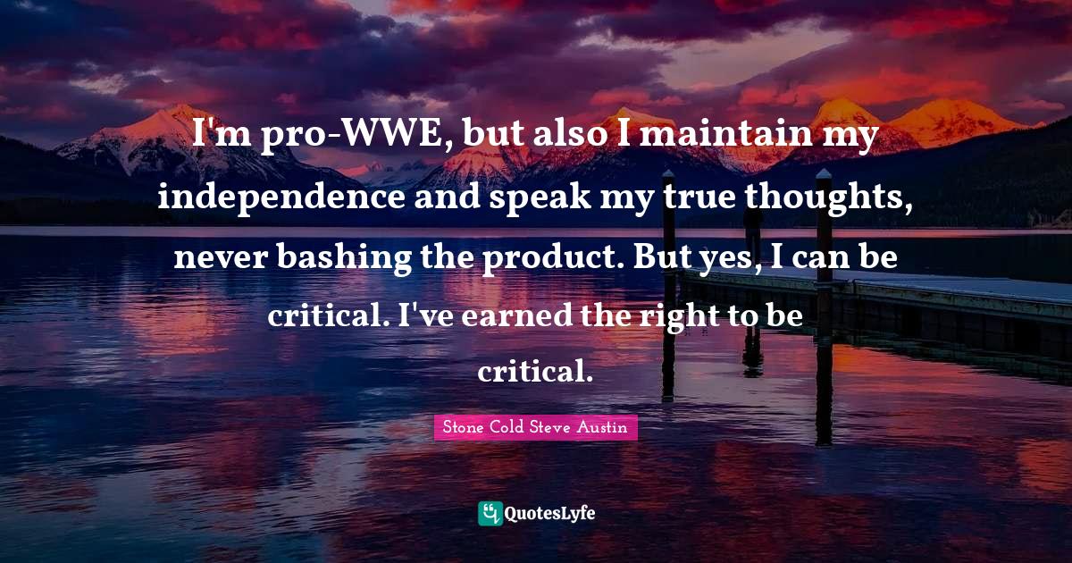 This page presents the quote "I'm pro-WWE, but also I maintain my independence and speak my true thoughts, never bashing the product. But yes, I can be critical. I've earned the right to be critical.". Author of this quote is Stone Cold Steve Austin. This quote is about true, thoughts, speak,.