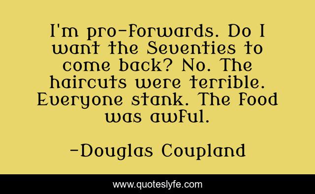 This page presents the quote "I'm pro-forwards. Do I want the Seventies to come back? No. The haircuts were terrible. Everyone stank. The food was awful.". Author of this quote is Douglas Coupland. This quote is about back, terrible,.