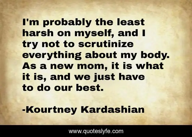 This page presents the quote "I'm probably the least harsh on myself, and I try not to scrutinize everything about my body. As a new mom, it is what it is, and we just have to do our best.". Author of this quote is Kourtney Kardashian. This quote is about body, myself, best,.