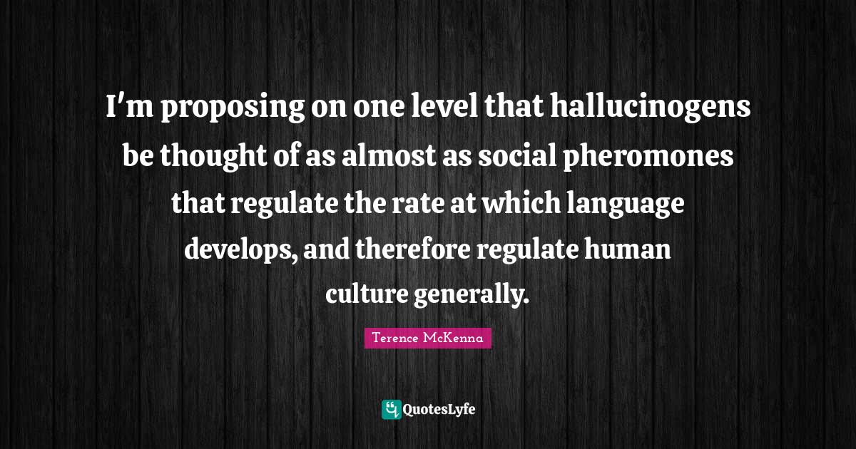 This page presents the quote "I'm proposing on one level that hallucinogens be thought of as almost as social pheromones that regulate the rate at which language develops, and therefore regulate human culture generally.". Author of this quote is Terence McKenna. This quote is about social, culture, levels, rate, language, hallucinogens, pheromones,.