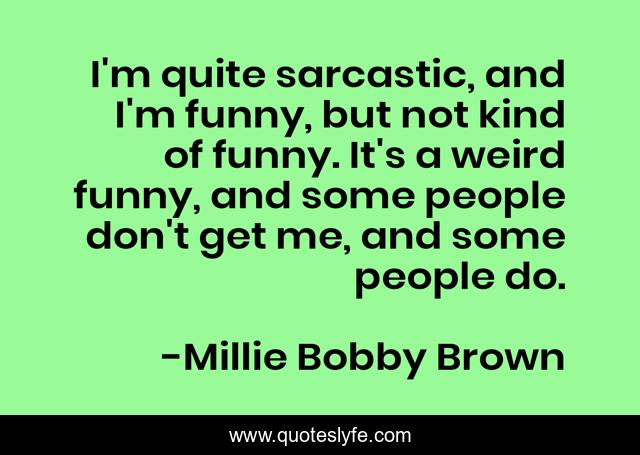 This page presents the quote "I'm quite sarcastic, and I'm funny, but not kind of funny. It's a weird funny, and some people don't get me, and some people do.". Author of this quote is Millie Bobby Brown. This quote is about me, weird, people,.