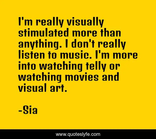 This page presents the quote "I'm really visually stimulated more than anything. I don't really listen to music. I'm more into watching telly or watching movies and visual art.". Author of this quote is Sia. This quote is about music, art, listen,.