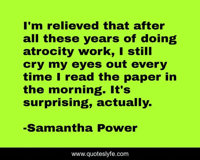 This page presents the quote "I'm relieved that after all these years of doing atrocity work, I still cry my eyes out every time I read the paper in the morning. It's surprising, actually.". Author of this quote is Samantha Power. This quote is about eyes, work, time,.