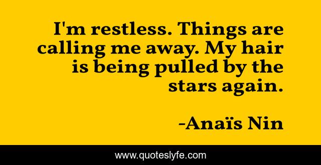 This page presents the quote "I'm restless. Things are calling me away. My hair is being pulled by the stars again.". Author of this quote is Anaïs Nin. This quote is about poem, anais-nin, poetry, quotes, beautiful-words, inspiration,.