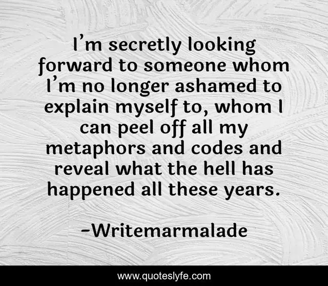 This page presents the quote "I’m secretly looking forward to someone whom I’m no longer ashamed to explain myself to, whom I can peel off all my metaphors and codes and reveal what the hell has happened all these years.". Author of this quote is Writemarmalade. This quote is about love, ashamed, relationship, honest, vunerable, truth, affection,.