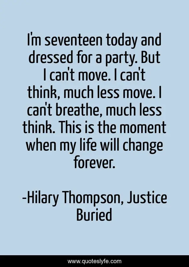 This page presents the quote "I'm seventeen today and dressed for a party. But I can't move. I can't think, much less move. I can't breathe, much less think. This is the moment when my life will change forever.". Author of this quote is Hilary Thompson, Justice Buried. This quote is about fear, growing-up, change, teenager,.