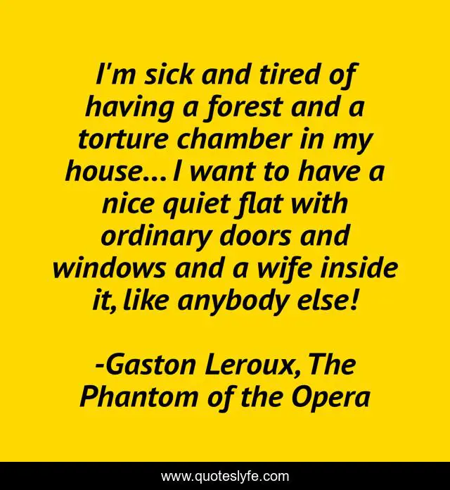 This page presents the quote "I'm sick and tired of having a forest and a torture chamber in my house... I want to have a nice quiet flat with ordinary doors and windows and a wife inside it, like anybody else!". Author of this quote is Gaston Leroux, The Phantom of the Opera. This quote is about normalcy, domesticity, erik, goals, phantom-of-the-opera,.
