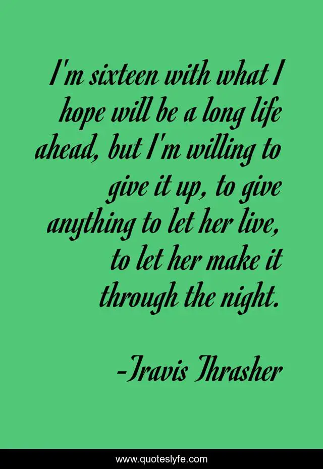 This page presents the quote "I'm sixteen with what I hope will be a long life ahead, but I'm willing to give it up, to give anything to let her live, to let her make it through the night.". Author of this quote is Travis Thrasher. This quote is about solitary, christian, redemption, solitary-tales-book-one-solitary, horror, christian-fiction, good-reads, travis-thrasher, type-of-jesus-christ,.