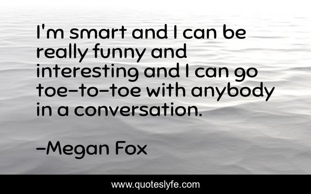 This page presents the quote "I'm smart and I can be really funny and interesting and I can go toe-to-toe with anybody in a conversation.". Author of this quote is Megan Fox. This quote is about conversation, smart,.
