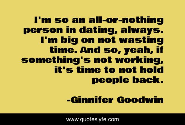 This page presents the quote "I'm so an all-or-nothing person in dating, always. I'm big on not wasting time. And so, yeah, if something's not working, it's time to not hold people back.". Author of this quote is Ginnifer Goodwin. This quote is about time, working, people,.
