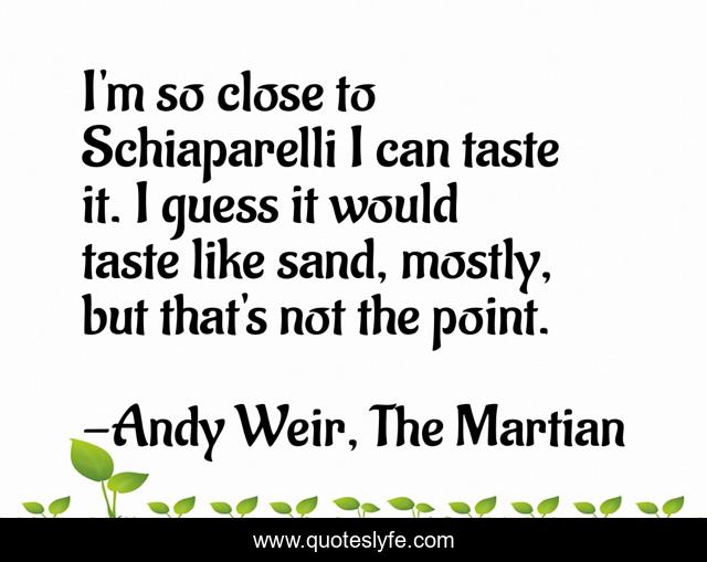 This page presents the quote "I'm so close to Schiaparelli I can taste it. I guess it would taste like sand, mostly, but that's not the point.". Author of this quote is Andy Weir, The Martian. This quote is about the-martian, science-fiction, mars,.