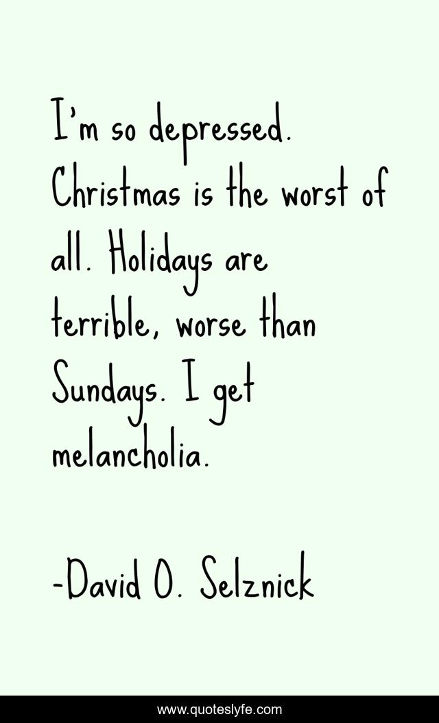 This page presents the quote "I'm so depressed. Christmas is the worst of all. Holidays are terrible, worse than Sundays. I get melancholia.". Author of this quote is David O. Selznick. This quote is about worst, terrible, holidays,.