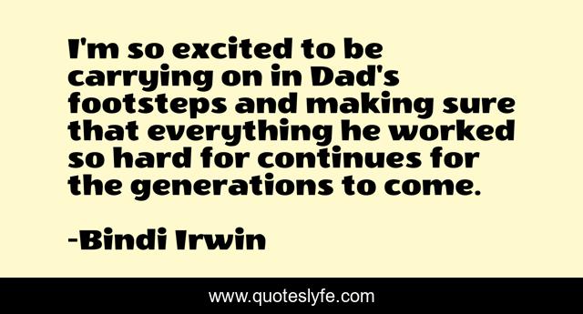 This page presents the quote "I'm so excited to be carrying on in Dad's footsteps and making sure that everything he worked so hard for continues for the generations to come.". Author of this quote is Bindi Irwin. This quote is about everything, hard, footsteps,.