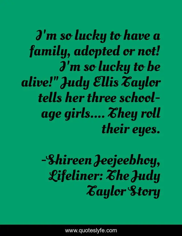 This page presents the quote "I'm so lucky to have a family, adopted or not! I'm so lucky to be alive!" Judy Ellis Taylor tells her three school-age girls.... They roll their eyes.". Author of this quote is Shireen Jeejeebhoy, Lifeliner: The Judy Taylor Story. This quote is about enthusiasm, humour, inspirational,.