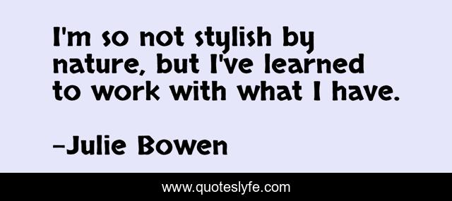 This page presents the quote "I'm so not stylish by nature, but I've learned to work with what I have.". Author of this quote is Julie Bowen. This quote is about stylish, learned, nature,.