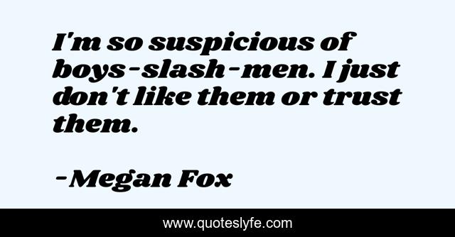 This page presents the quote "I'm so suspicious of boys-slash-men. I just don't like them or trust them.". Author of this quote is Megan Fox. This quote is about suspicious, like, just,.