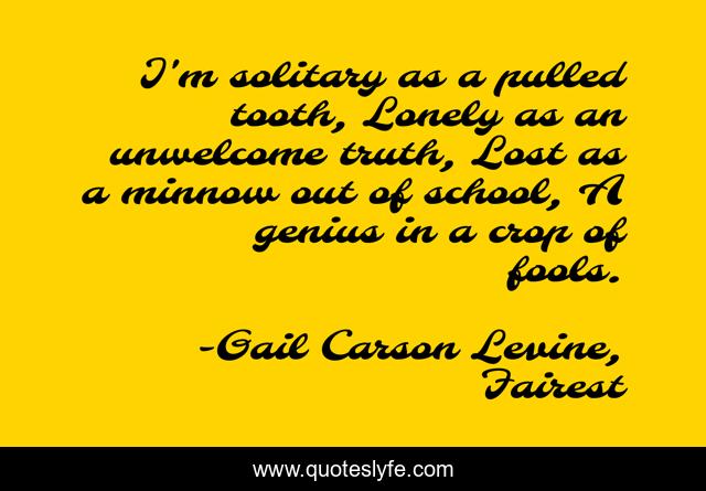 This page presents the quote "I'm solitary as a pulled tooth, Lonely as an unwelcome truth, Lost as a minnow out of school, A genius in a crop of fools.". Author of this quote is Gail Carson Levine, Fairest. .