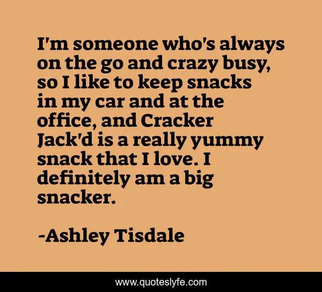 This page presents the quote "I'm someone who's always on the go and crazy busy, so I like to keep snacks in my car and at the office, and Cracker Jack'd is a really yummy snack that I love. I definitely am a big snacker.". Author of this quote is Ashley Tisdale. This quote is about crazy, busy, love, affection,.