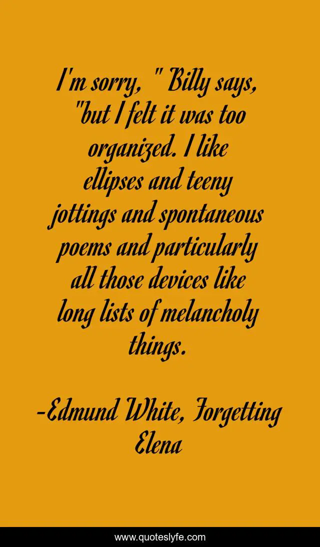 This page presents the quote "I'm sorry, " Billy says, "but I felt it was too organized. I like ellipses and teeny jottings and spontaneous poems and particularly all those devices like long lists of melancholy things.". Author of this quote is Edmund White, Forgetting Elena. .