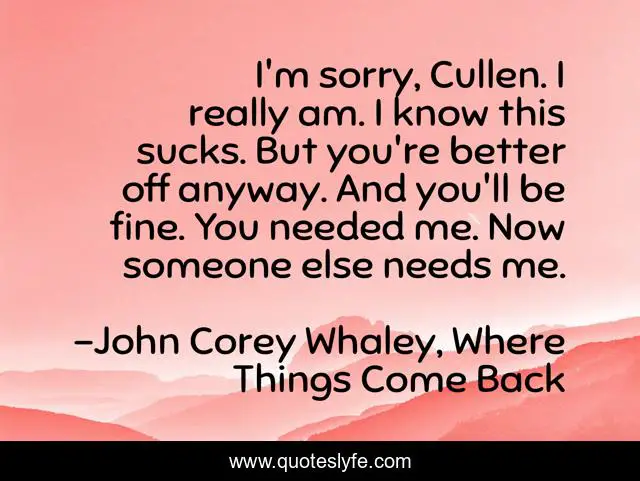This page presents the quote "I'm sorry, Cullen. I really am. I know this sucks. But you're better off anyway. And you'll be fine. You needed me. Now someone else needs me.". Author of this quote is John Corey Whaley, Where Things Come Back. This quote is about love, cullen-witter, need, john-corey-whaley, where-things-come-back, affection,.