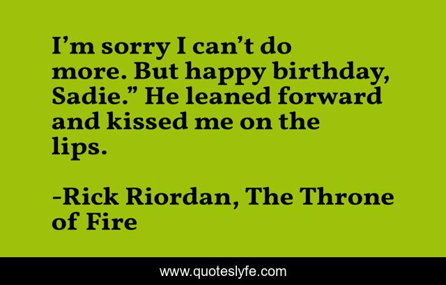 This page presents the quote "I’m sorry I can’t do more. But happy birthday, Sadie.” He leaned forward and kissed me on the lips.". Author of this quote is Rick Riordan, The Throne of Fire. This quote is about cute, love, kiss, sweet, anubis, lips, birthday, sadie-kane, affection,.