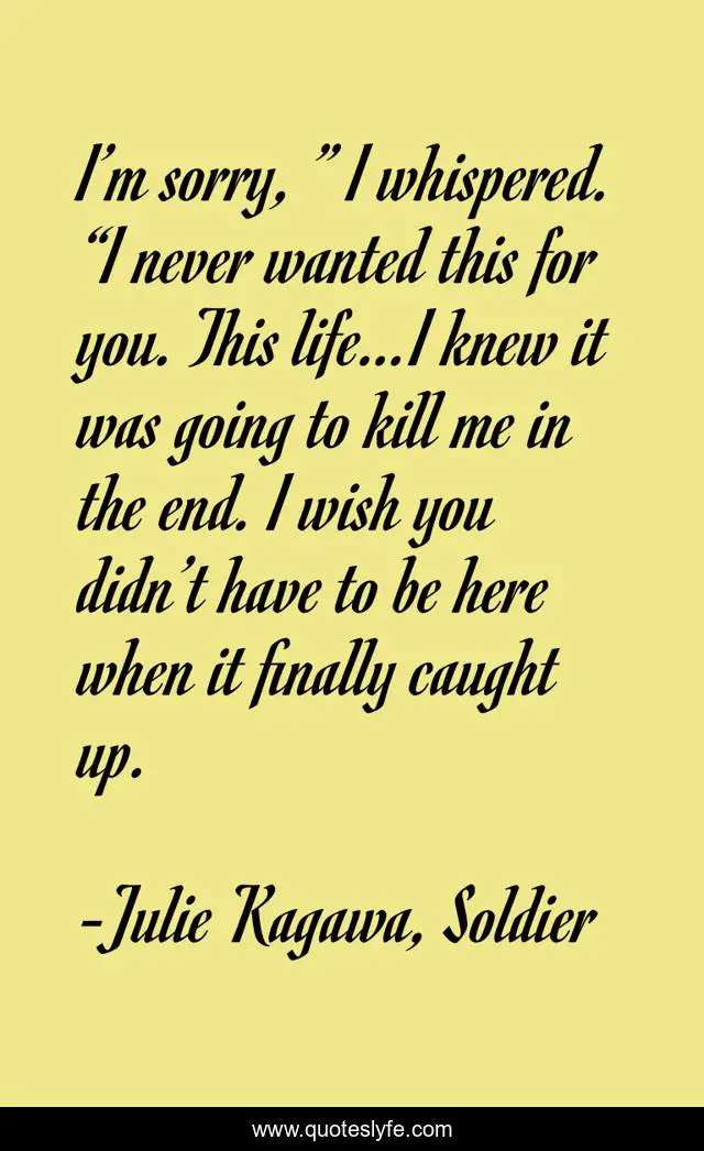 "Julie Kagawa, Soldier Quotes." Quoteslyfe.com, 2025. Mon. 08 Dec. 2025. <https://www.quoteslyfe.com/quote/I-m-sorry-I-whispered-I-never-229676>.