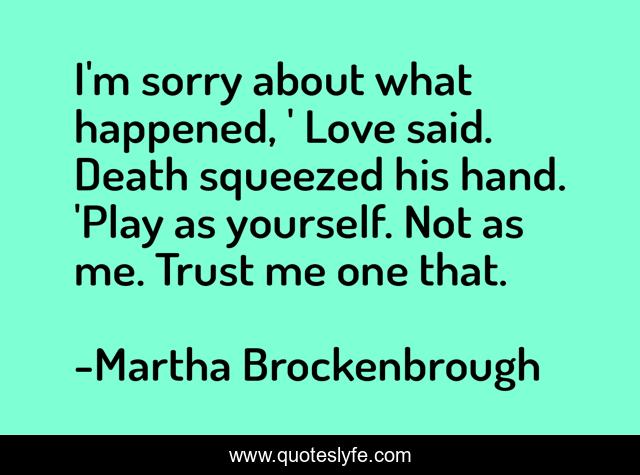 This page presents the quote "I'm sorry about what happened, ' Love said. Death squeezed his hand. 'Play as yourself. Not as me. Trust me one that.". Author of this quote is Martha Brockenbrough. This quote is about guilt, death, love, understanding-yourself, affection,.
