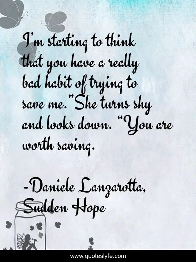This page presents the quote "I’m starting to think that you have a really bad habit of trying to save me.”She turns shy and looks down. “You are worth saving.". Author of this quote is Daniele Lanzarotta, Sudden Hope. This quote is about bullying, ya, sudden-hope, yalit, teen-fiction,.