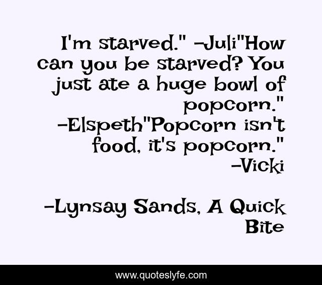 This page presents the quote "I'm starved." -Juli"How can you be starved? You just ate a huge bowl of popcorn." -Elspeth"Popcorn isn't food, it's popcorn." -Vicki". Author of this quote is Lynsay Sands, A Quick Bite. This quote is about food, sisters, comedy, vampires, immortals,.