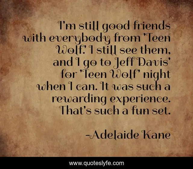 This page presents the quote "I'm still good friends with everybody from 'Teen Wolf.' I still see them, and I go to Jeff Davis' for 'Teen Wolf' night when I can. It was such a rewarding experience. That's such a fun set.". Author of this quote is Adelaide Kane. This quote is about good, friends, experience,.