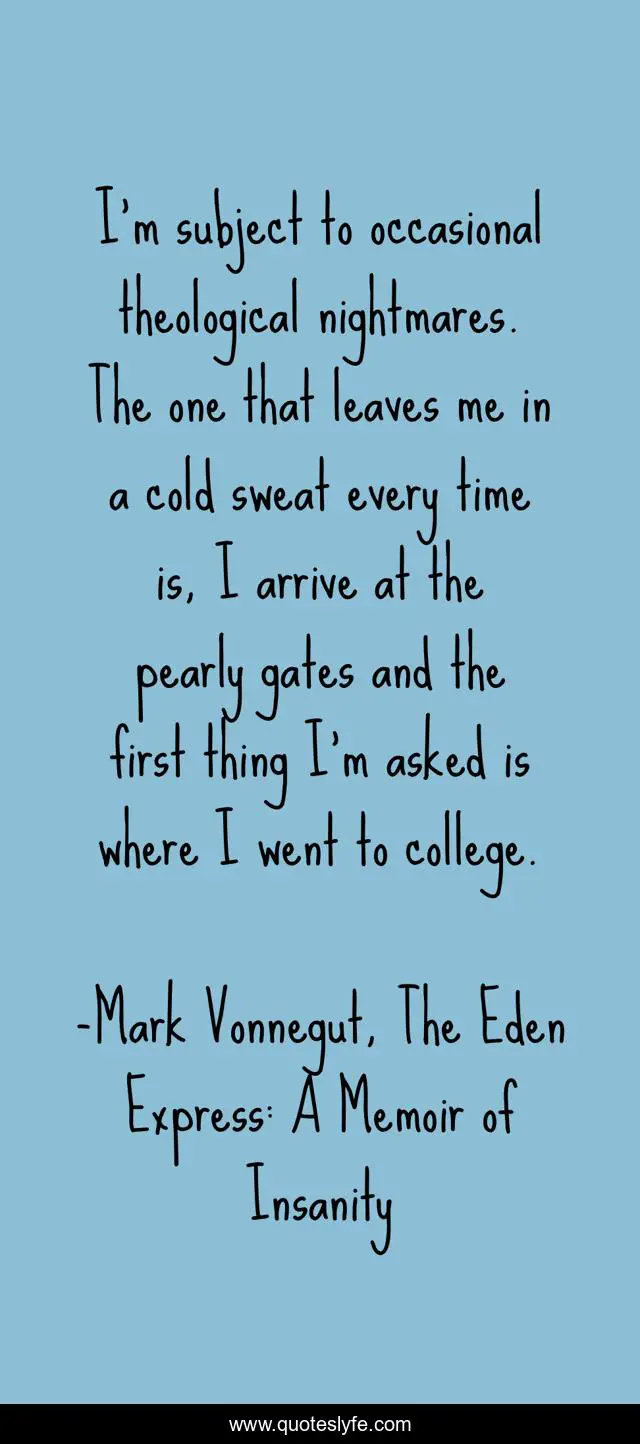This page presents the quote "I’m subject to occasional theological nightmares. The one that leaves me in a cold sweat every time is, I arrive at the pearly gates and the first thing I’m asked is where I went to college.". Author of this quote is Mark Vonnegut, The Eden Express: A Memoir of Insanity. .