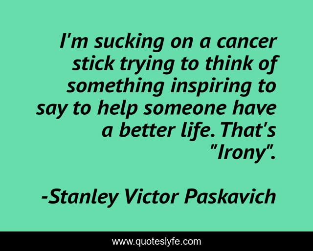 This page presents the quote "I'm sucking on a cancer stick trying to think of something inspiring to say to help someone have a better life. That's "Irony".". Author of this quote is Stanley Victor Paskavich. .