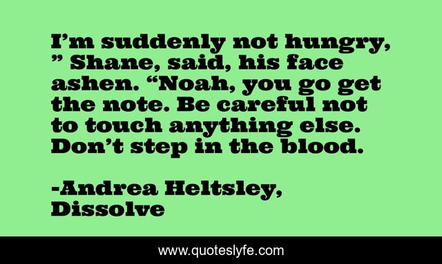 This page presents the quote "I’m suddenly not hungry, ” Shane, said, his face ashen. “Noah, you go get the note. Be careful not to touch anything else. Don’t step in the blood.". Author of this quote is Andrea Heltsley, Dissolve. This quote is about mystery, murder, nauseous,.
